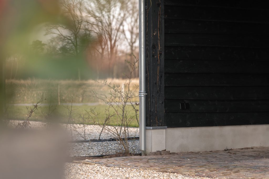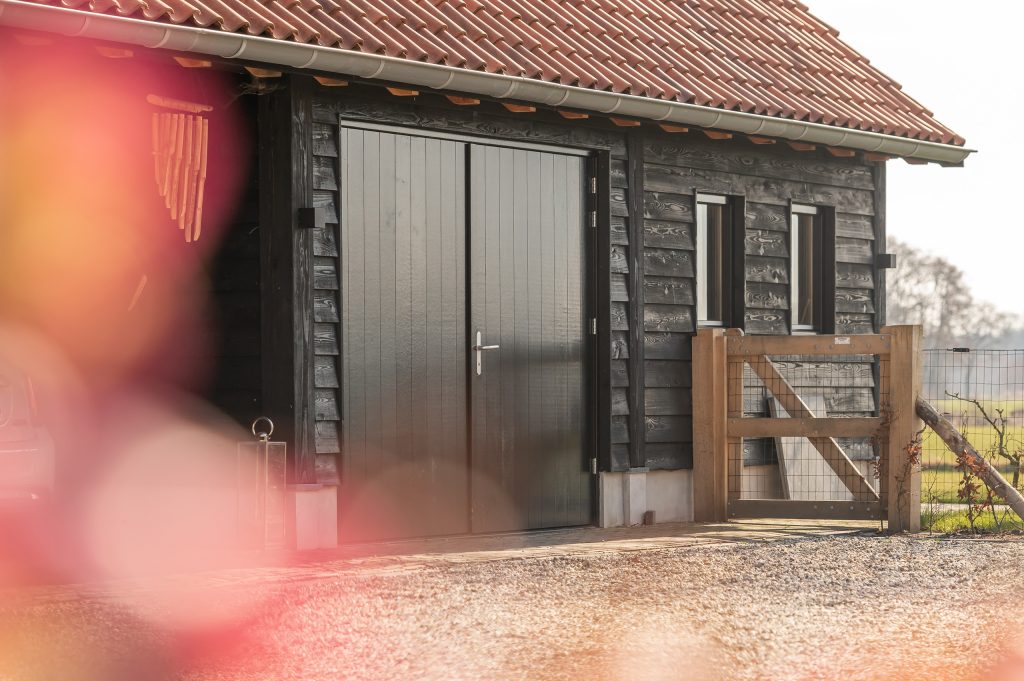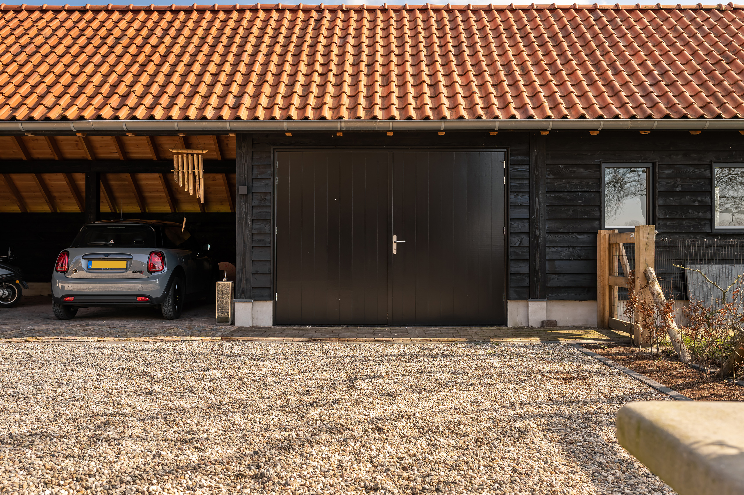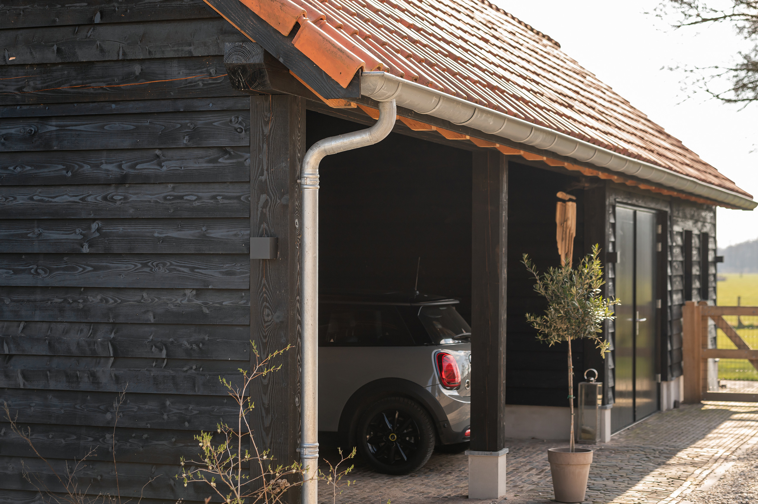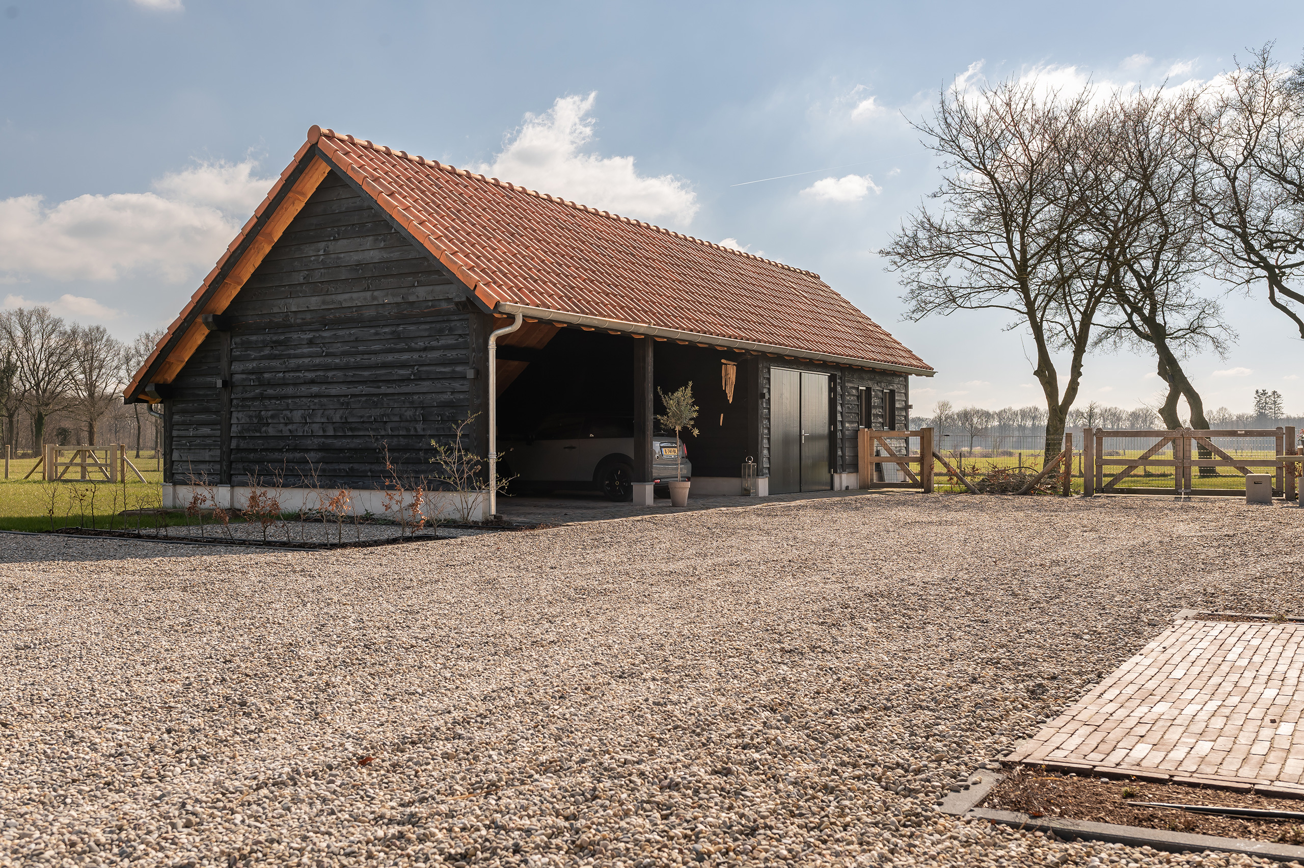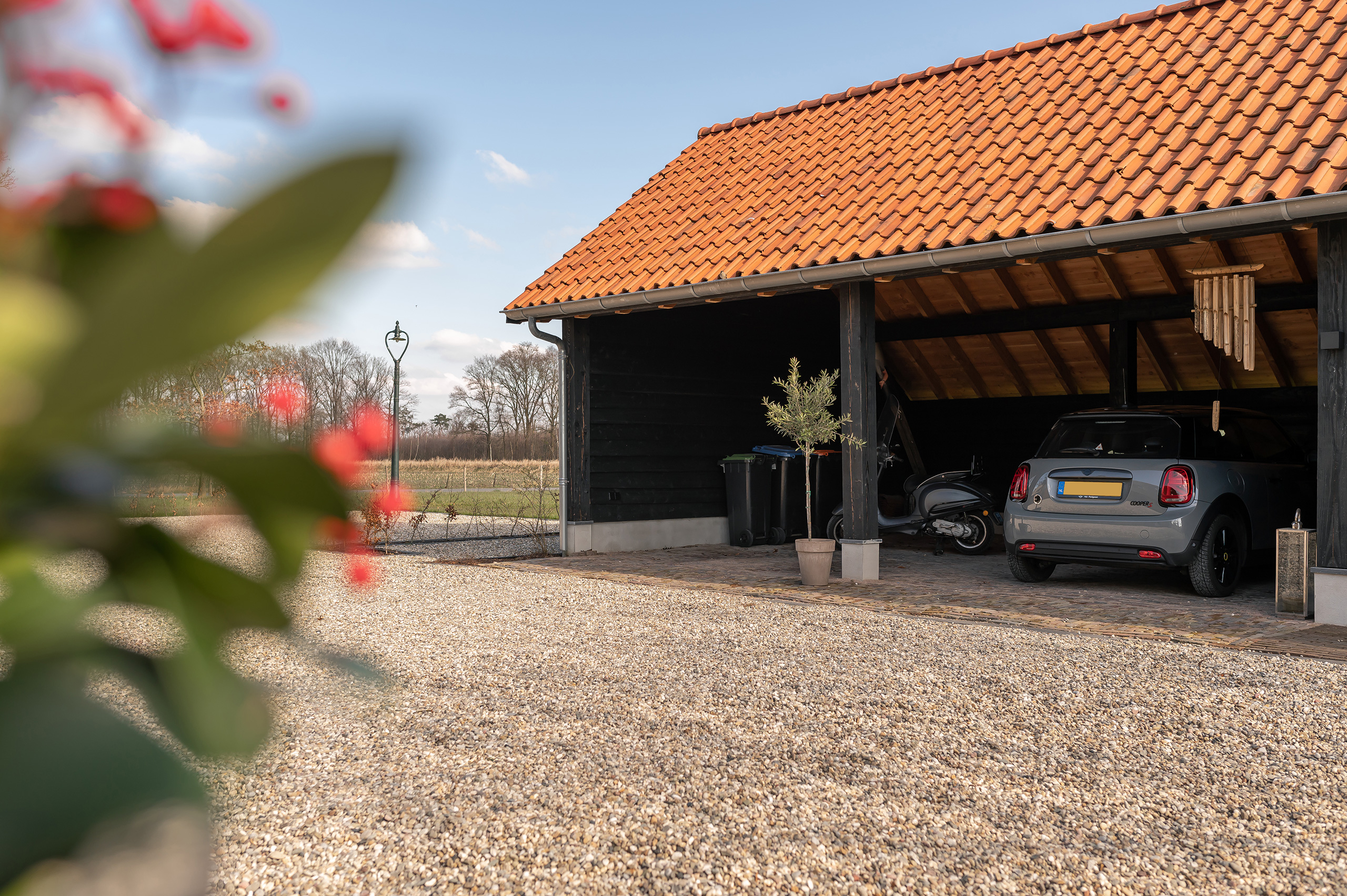 Het voorste gedeelte van deze schuur is opgebouwd uit een carport, het achterste gedeelte is afgewerkt met een schuur. Deze schuur heeft een landelijke stijl en heeft een kapschuren model. Dankzij de hoge nok, geeft deze schuur een ruimtelijk gevoel. De schuur is voorzien van oude holle dakpannen en een zwarte constructie.