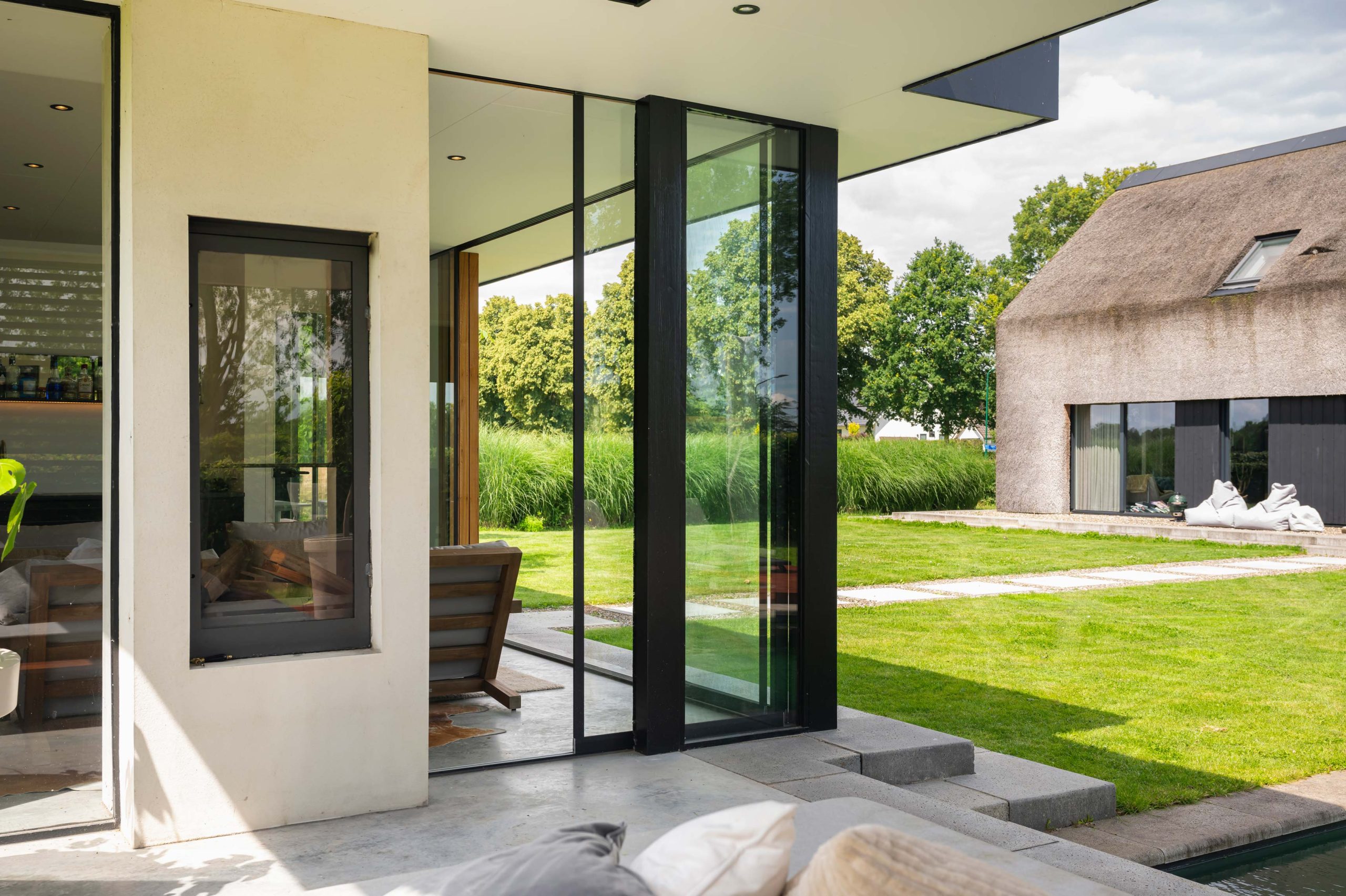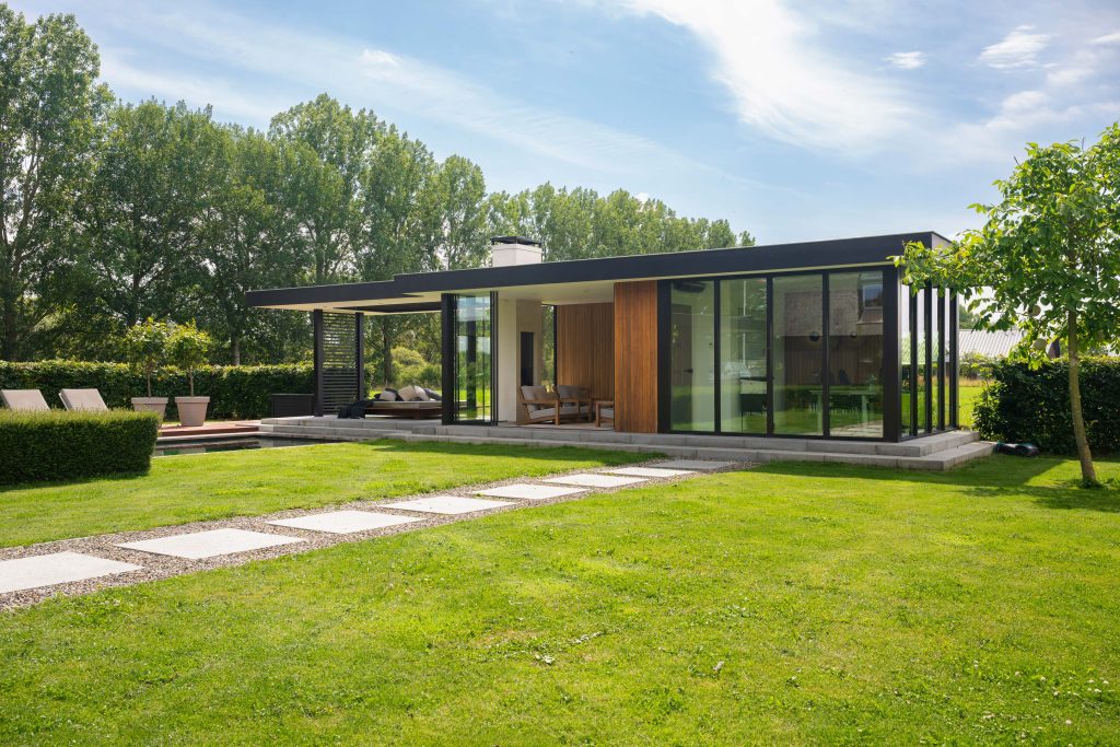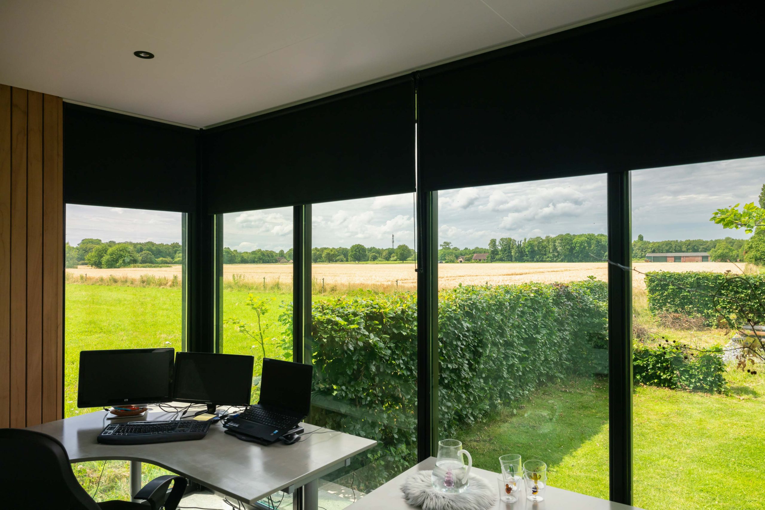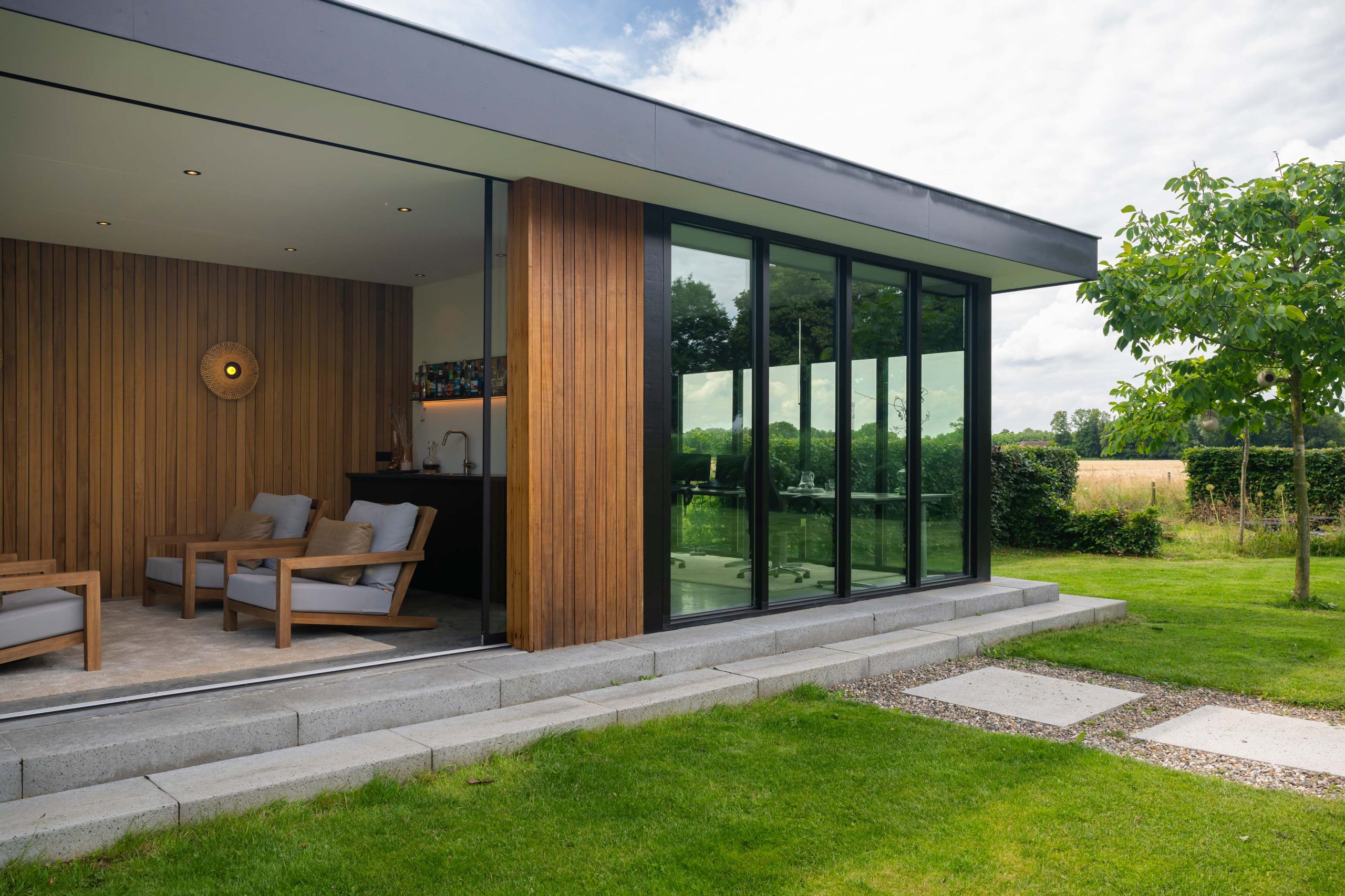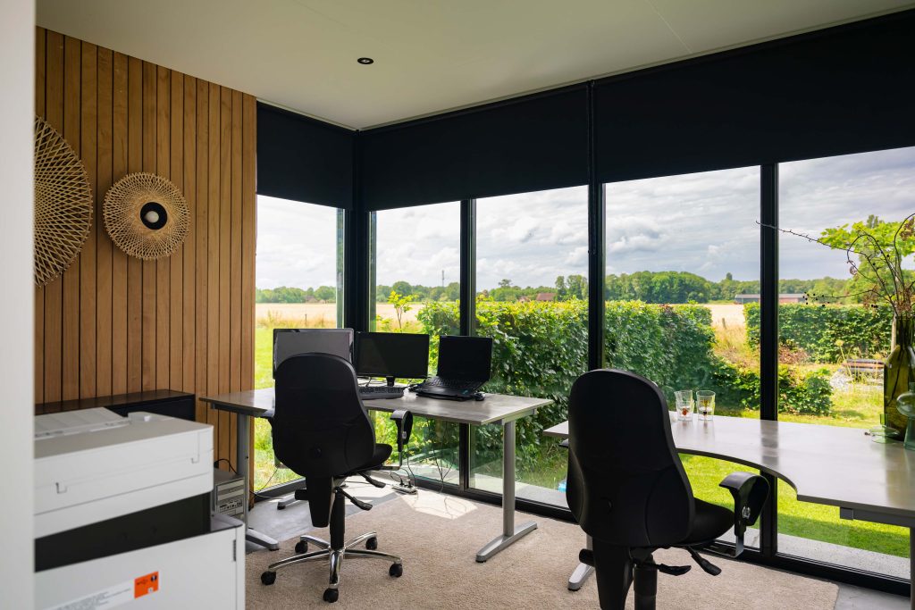 In de tuinkamer bevindt zich een thuiskantoor van 4 bij 4 meter. Zo kan er gewerkt worden met een prachtig uitzicht. Het kantoor is geïsoleerd met vaste kozijnen. Ook heeft de tuinkamer glazen schuifdeuren met aluminium strips en een gestucte doorkijkhaar.