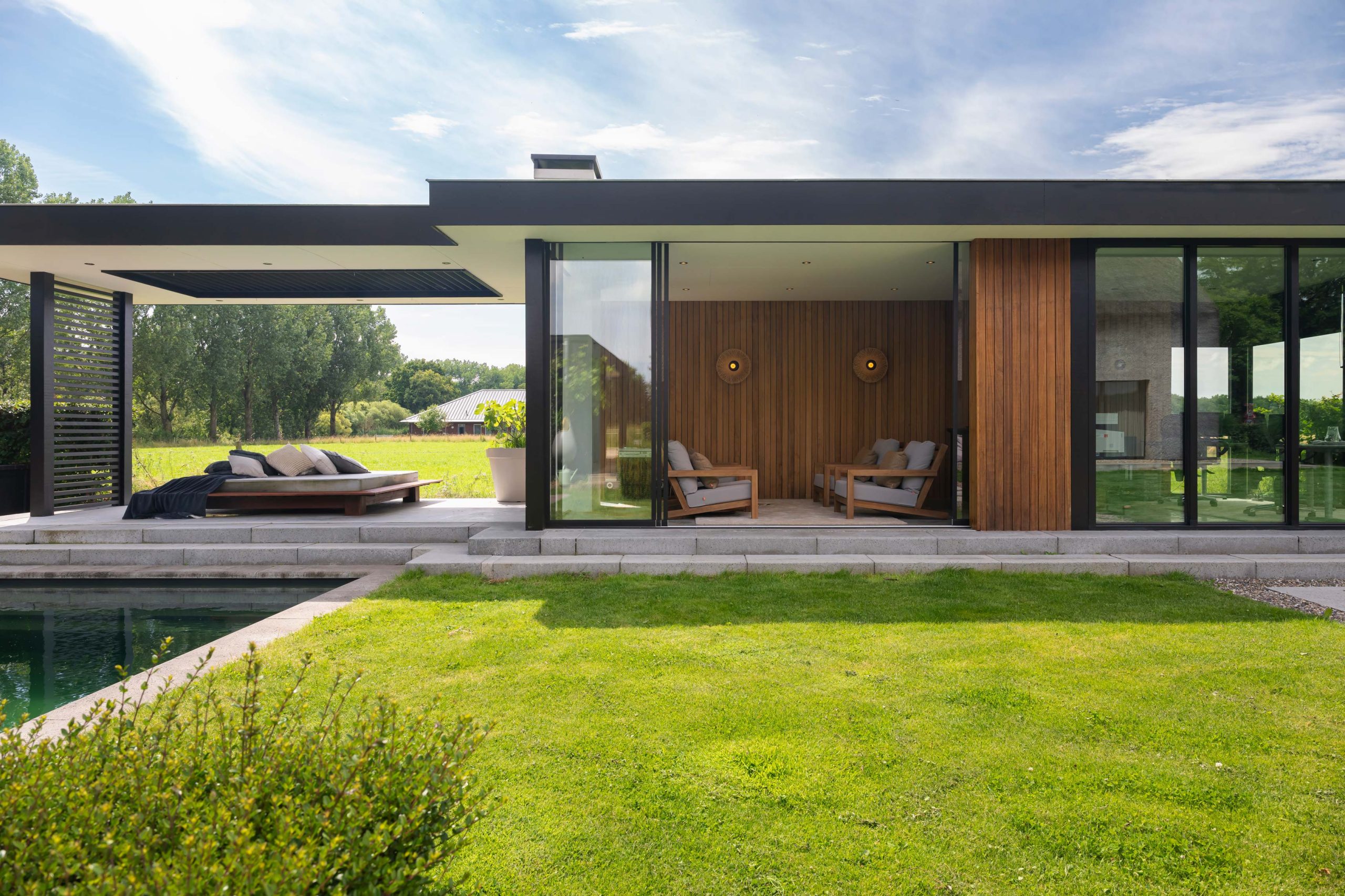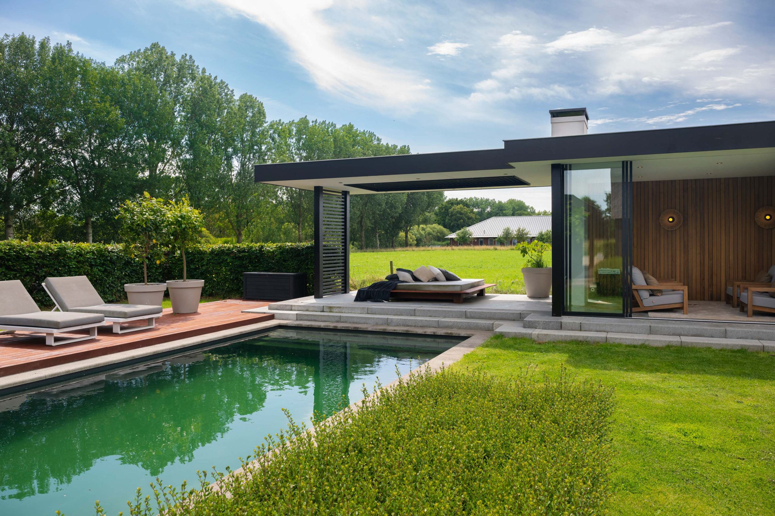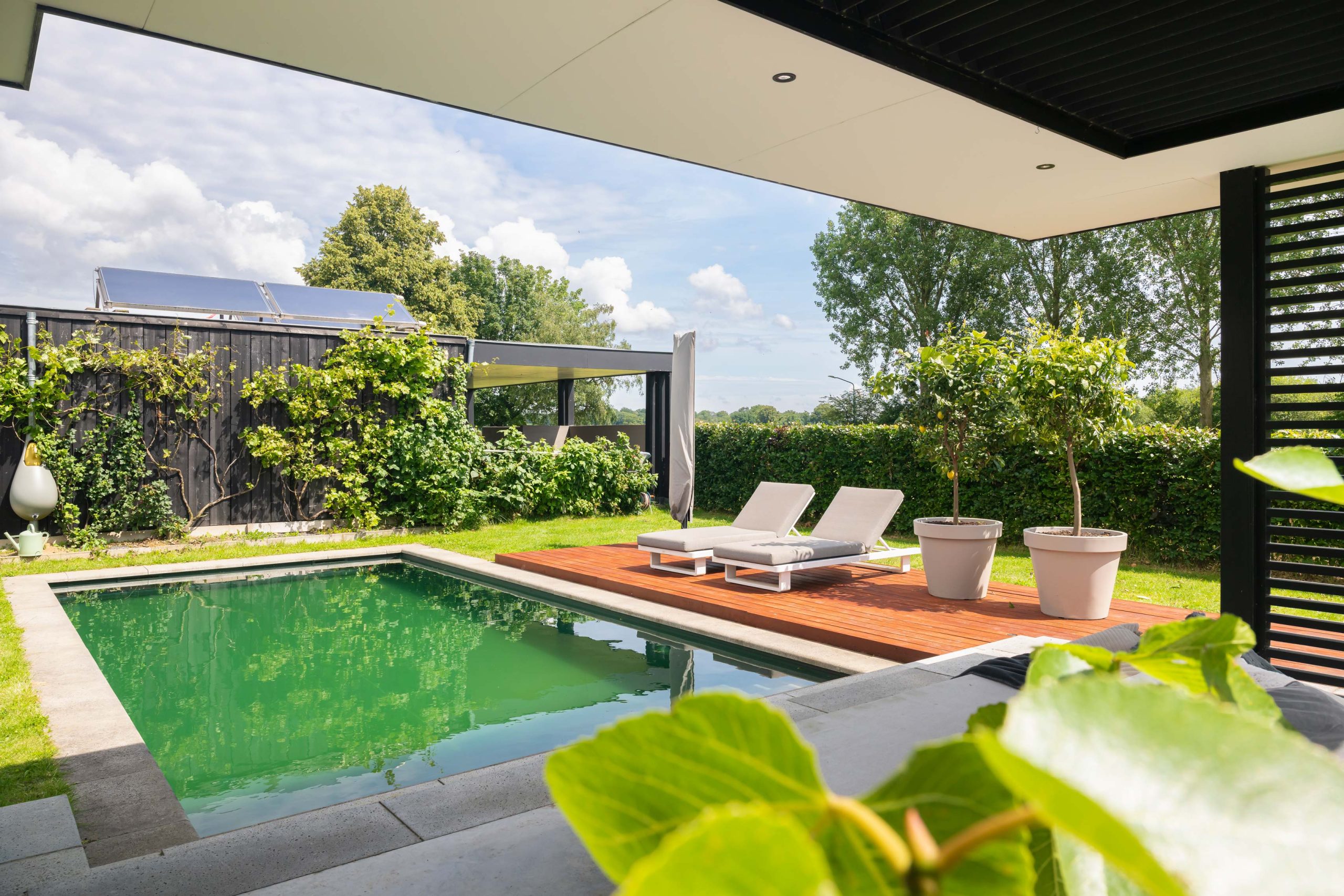 We hebben een aansluitend houten lamellen dak geplaatst aan de tuinkamer. Rondom het hele zwembad is een Bankirai hardhouten vlonder betimmerd.