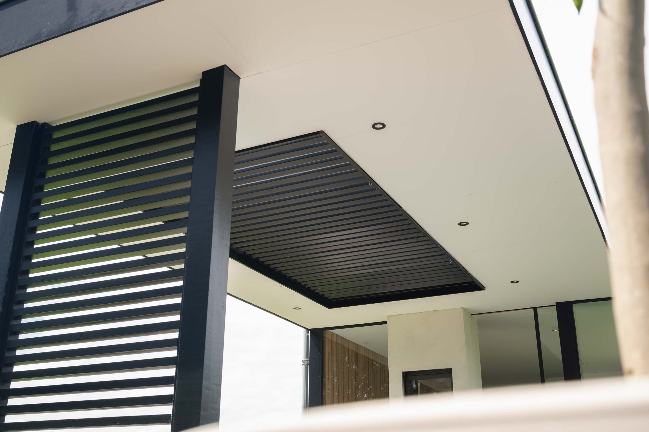 Het loungegedeelte van 5 bij 4 meter zorgt ervoor dat er een heerlijk zitplek is. De achterwand van ayous latten (7 cm breed) geeft de tuinkamer een warme uitstraling. De luifel is 4 bij 3 m.