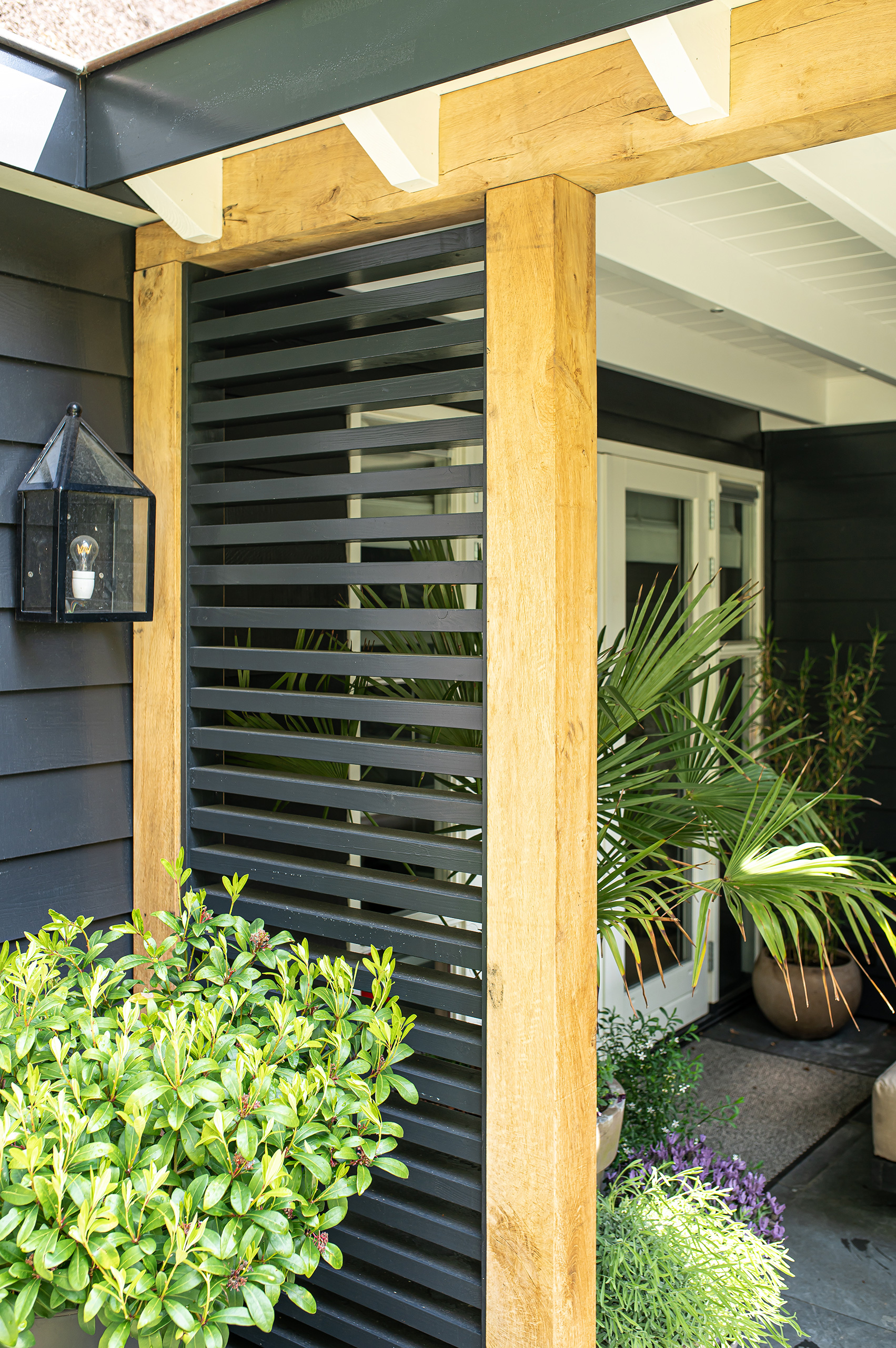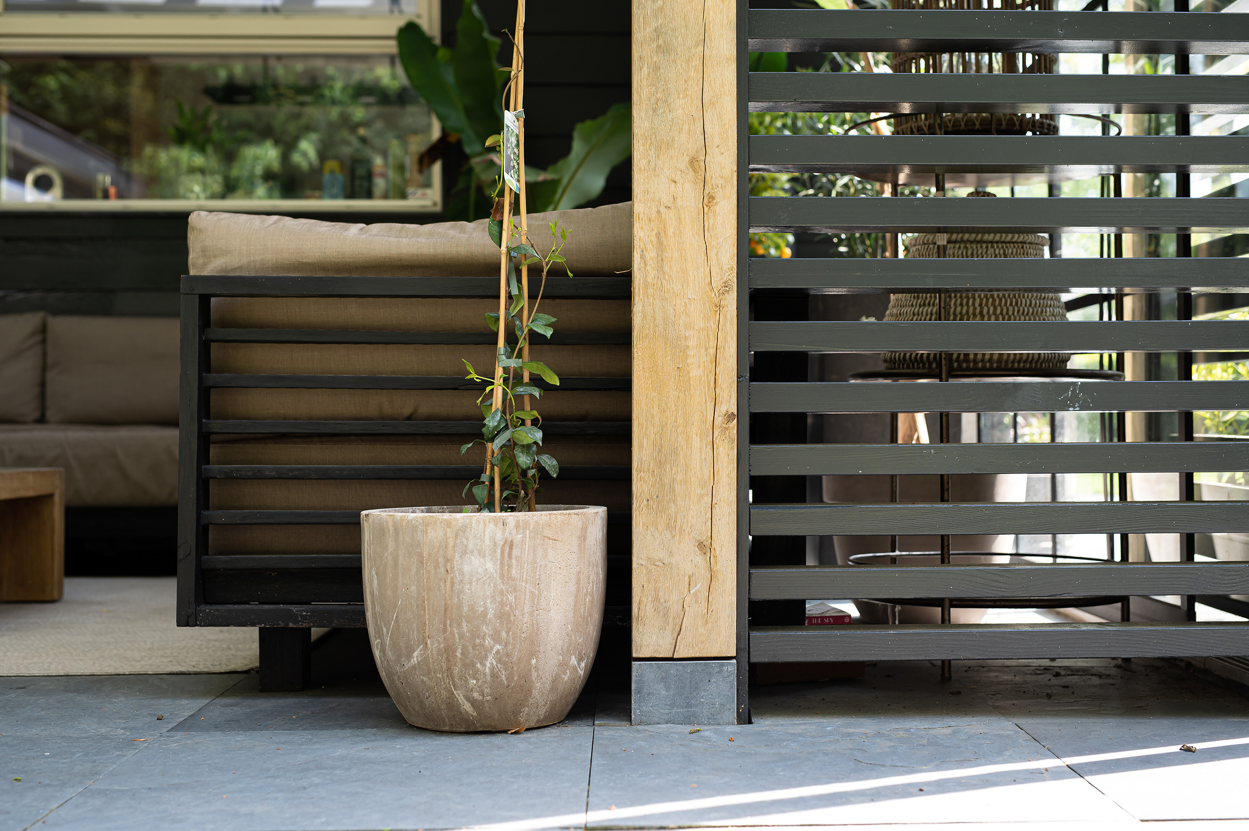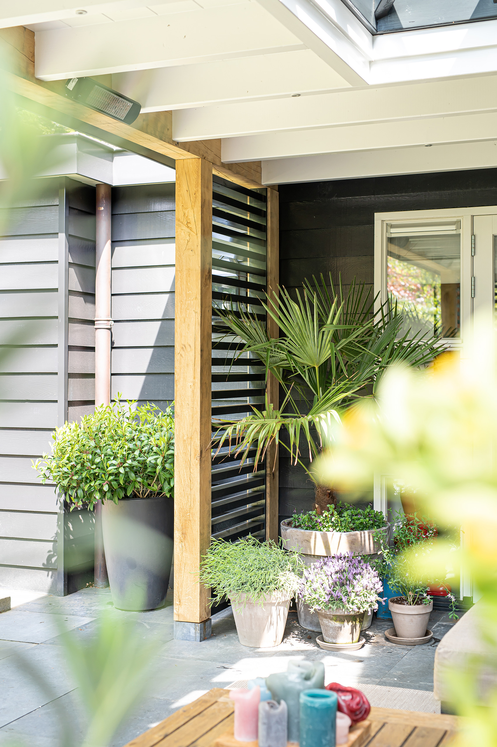 De woning kenmerkt zich door een warme, landelijke stijl, gelegen in een bosrijke omgeving. Daarbij passen de warme tinten en zorgt het het witte plafond voor samen met het vele groen in de veranda voor een frisse sfeer.