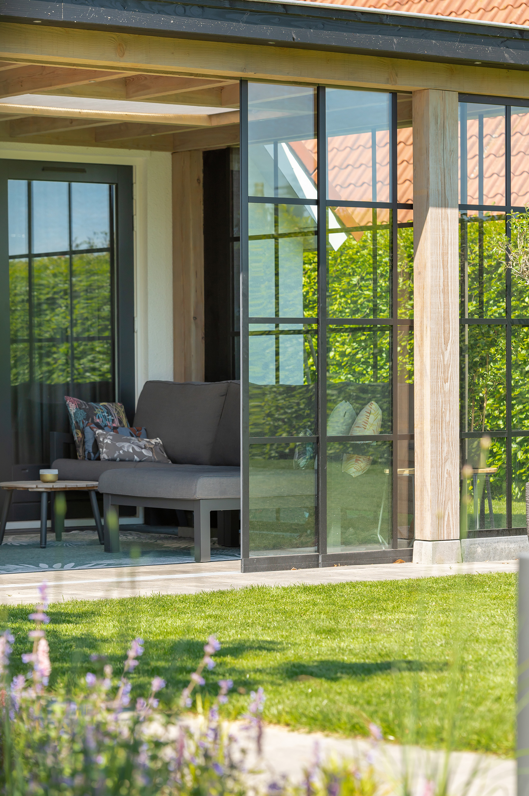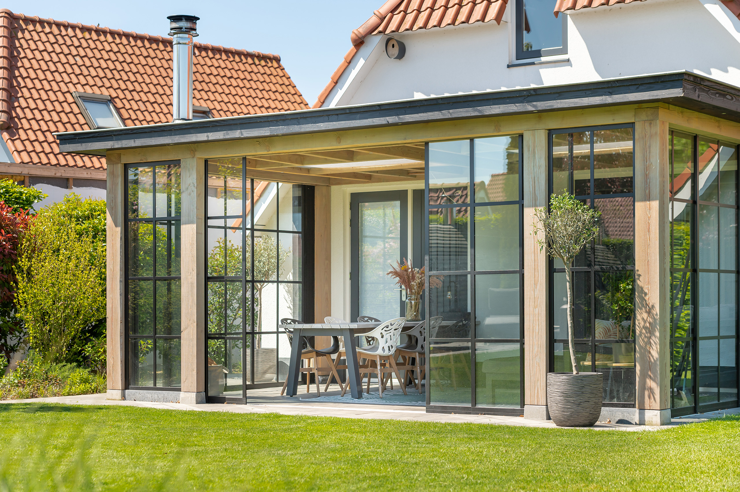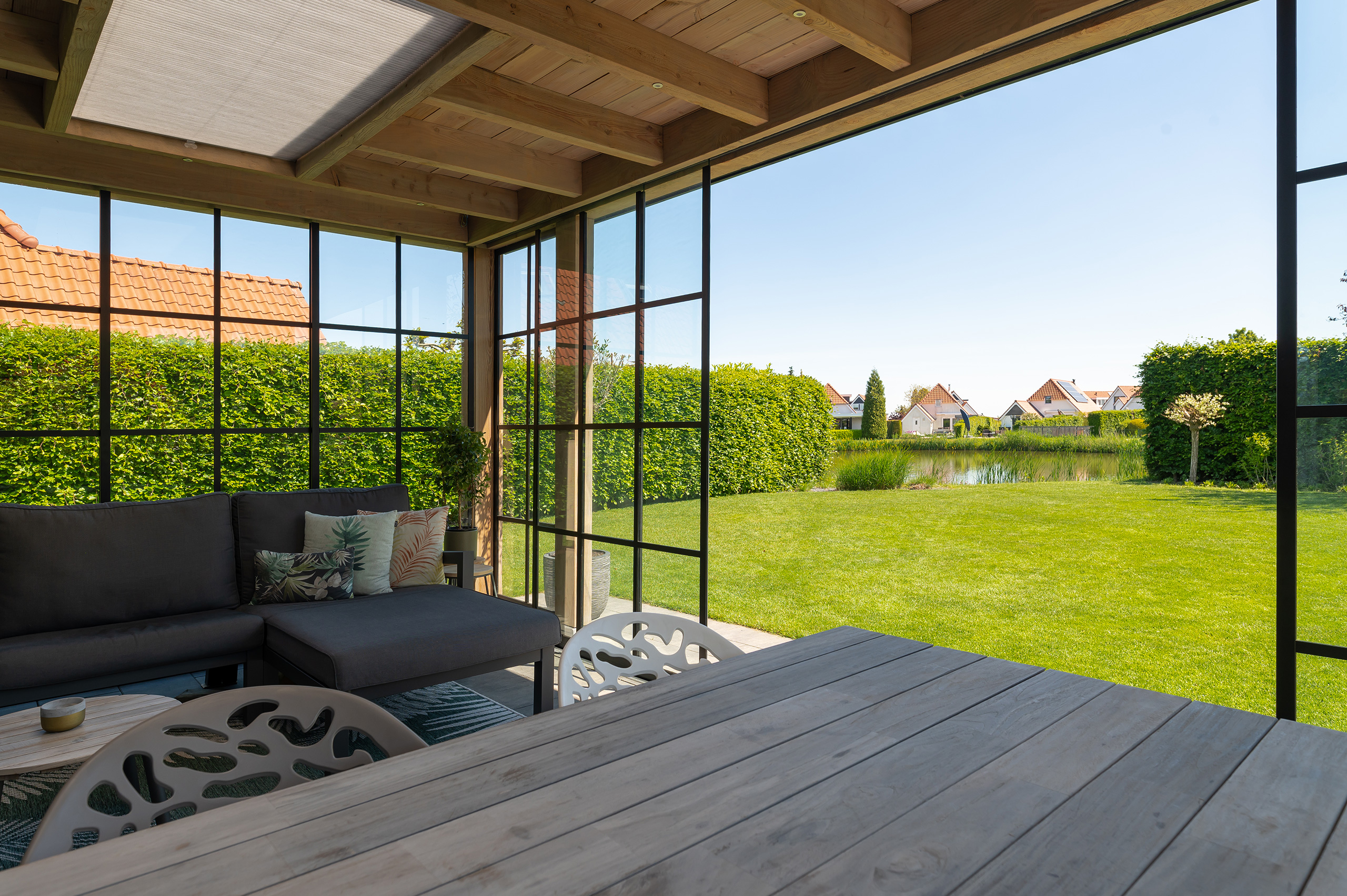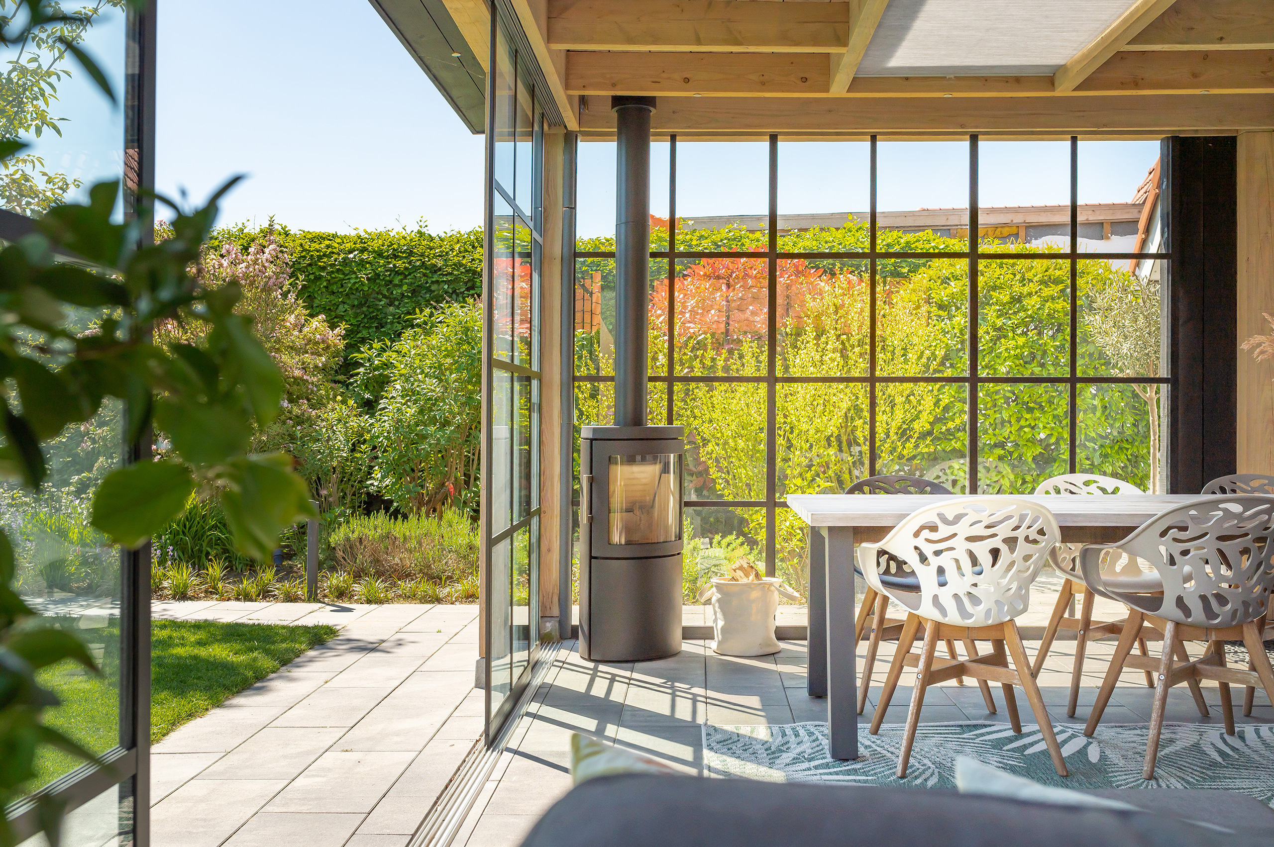 Deze buitenkamer laat u elk moment van de dag genieten. Een gezellige plek om te lunchen en een fijne zithoek heeft u altijd binnen handbereik. Is het buiten iets frisser dan verwacht? Dan sluit u de glazen schuifpuien en steekt u de houtkachel even aan.