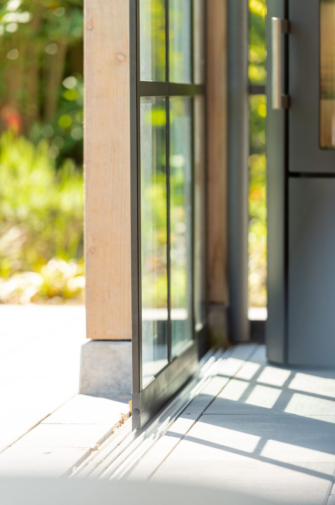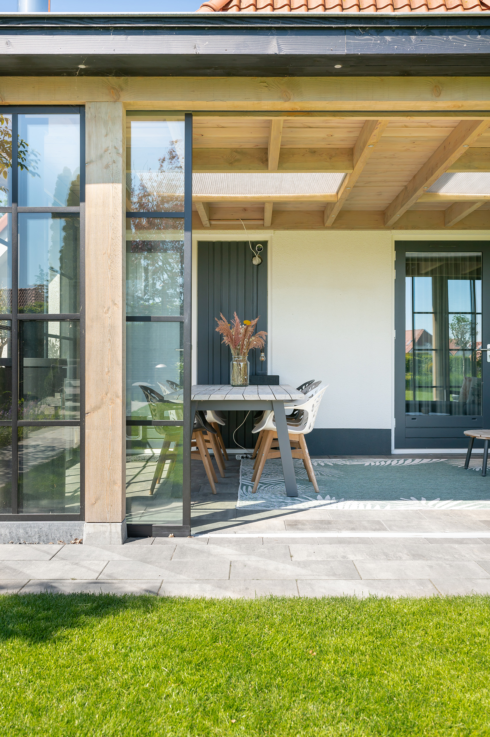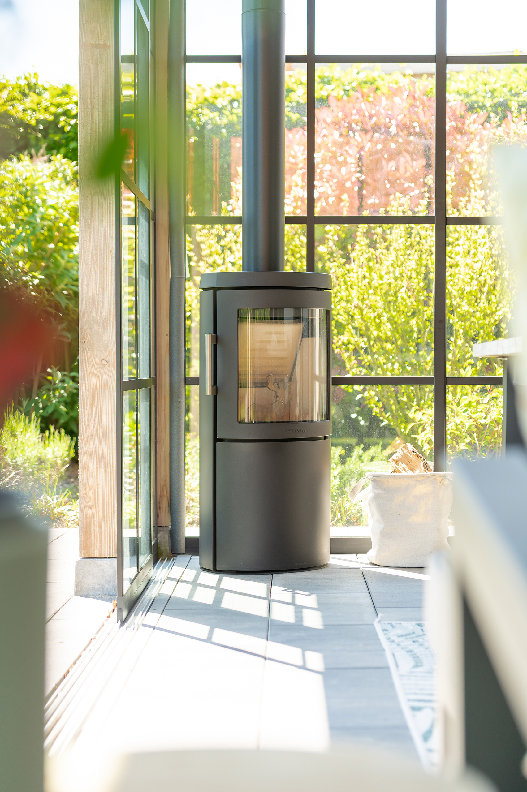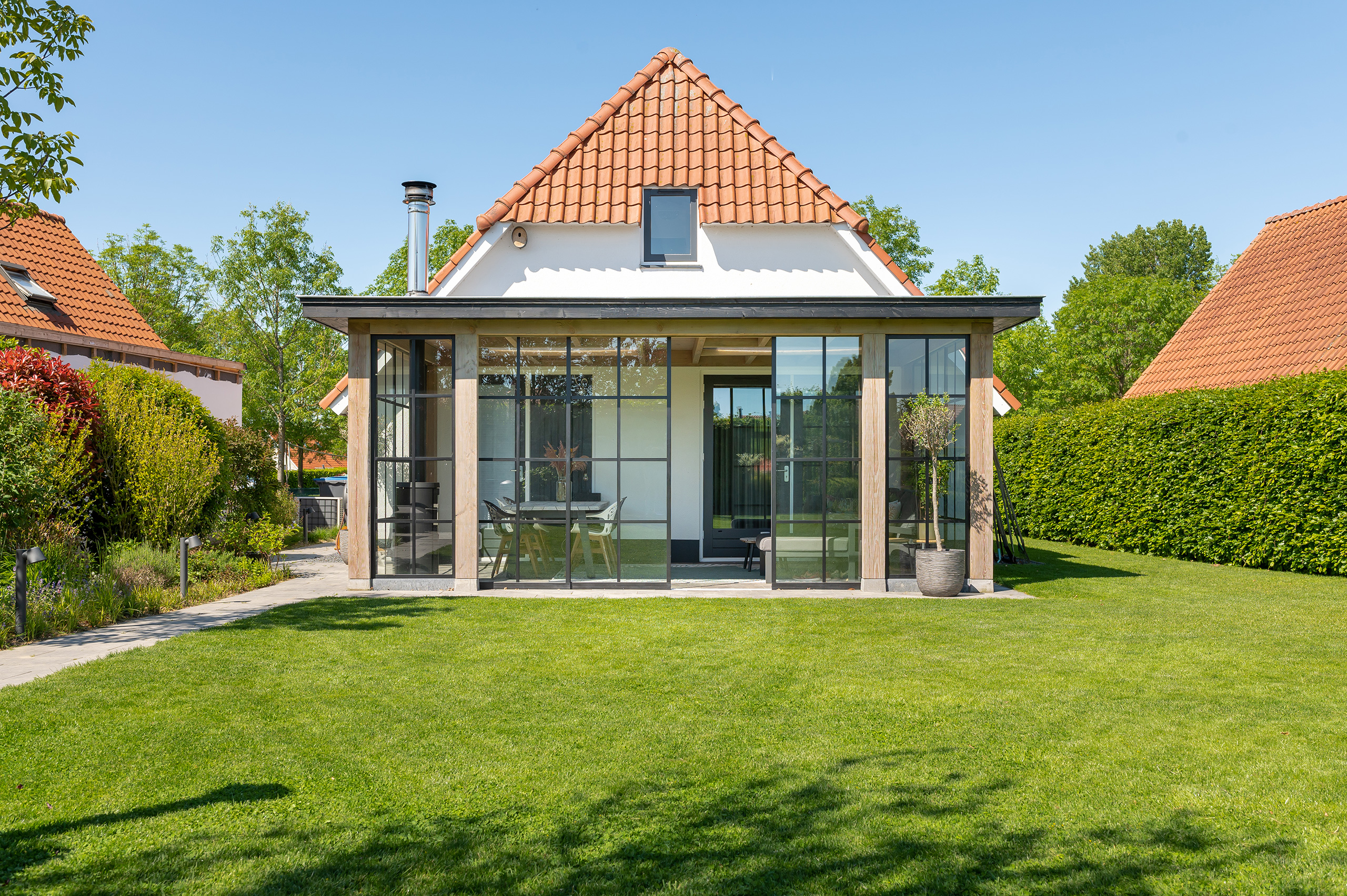 Deze buitenkamer laat u elk moment van de dag genieten. Een gezellige plek om te lunchen en een fijne zithoek heeft u altijd binnen handbereik. Is het buiten iets frisser dan verwacht? Dan sluit u de glazen schuifpuien en steekt u de houtkachel even aan.