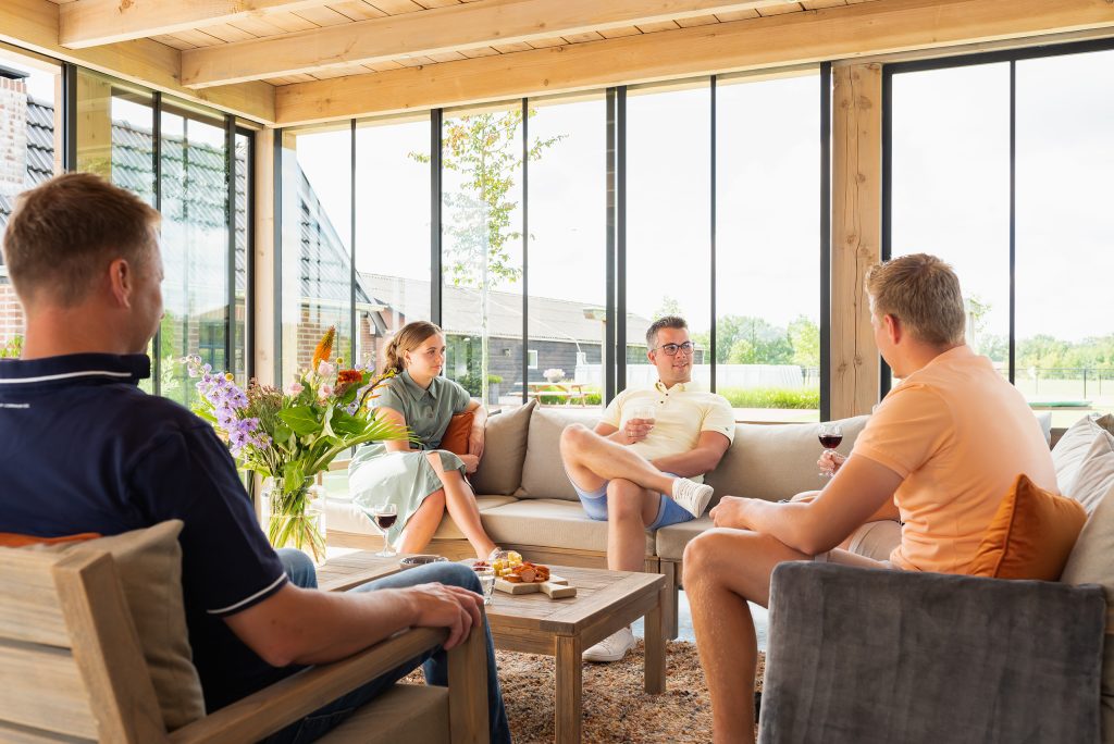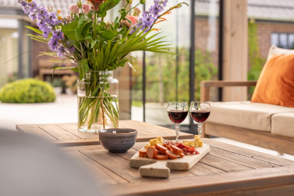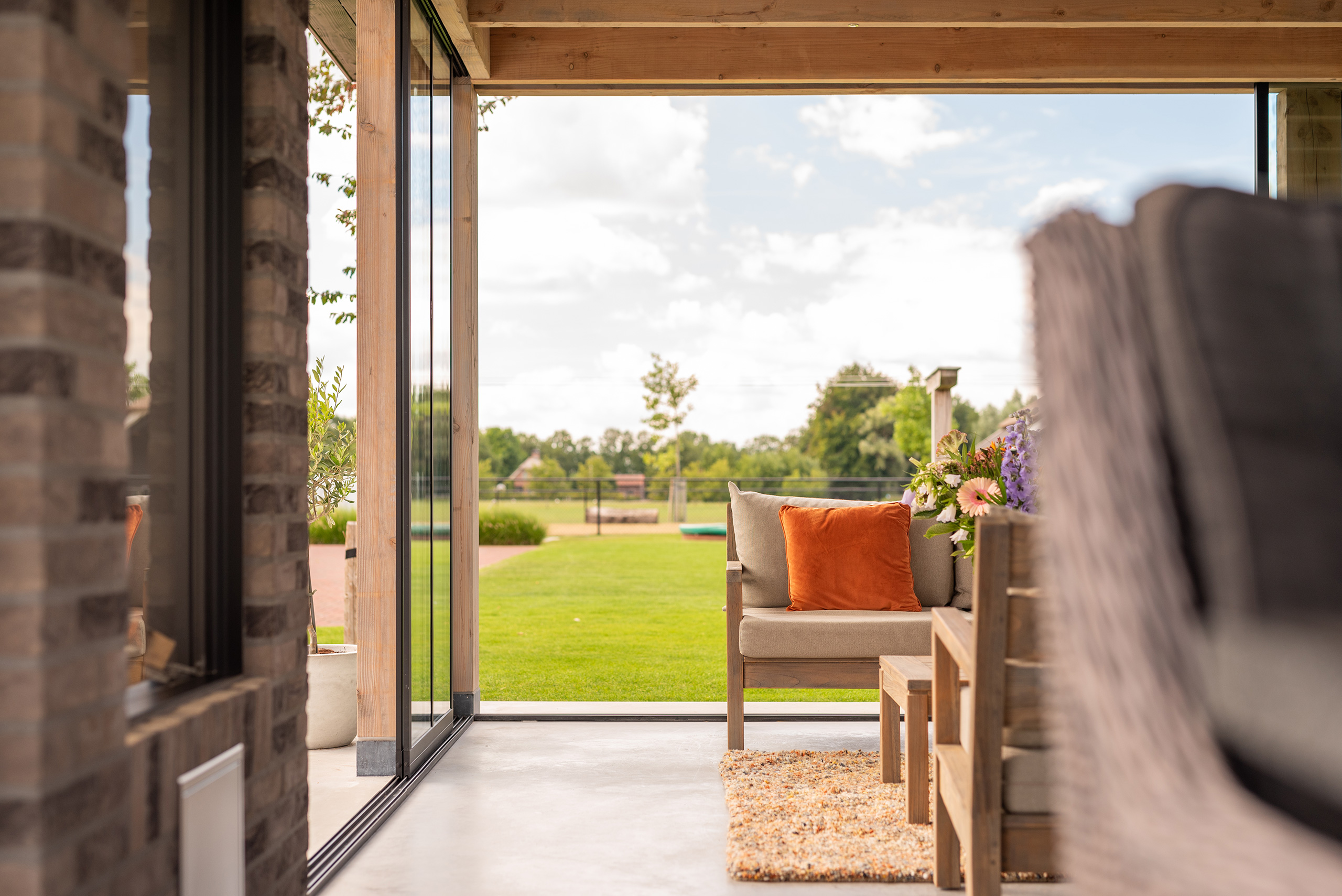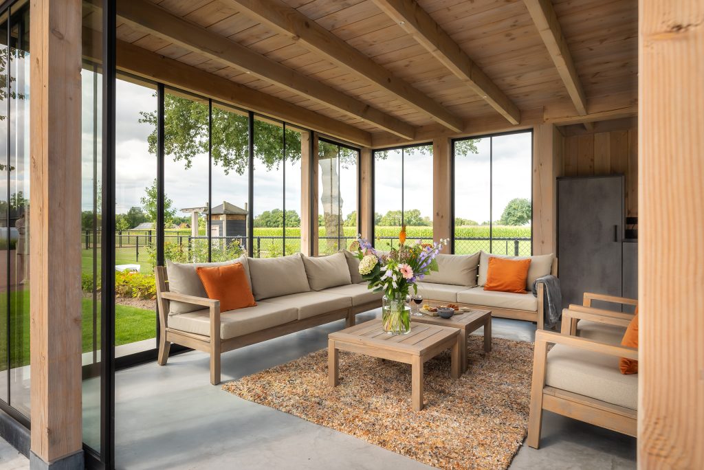Mede door deze voorzieningen en de glazen deuren, uitgevoerd in verticaal staal, is deze tuinkamer daadwerkelijk elk seizoen te gebruiken. Op de warme zomerdagen schuift u de deuren volledig open en geniet u van een heerlijke bries. Op de koudere herfst of voorjaarsavond sluit u ze vanzelfsprekend om een beschutte plek te creëren.