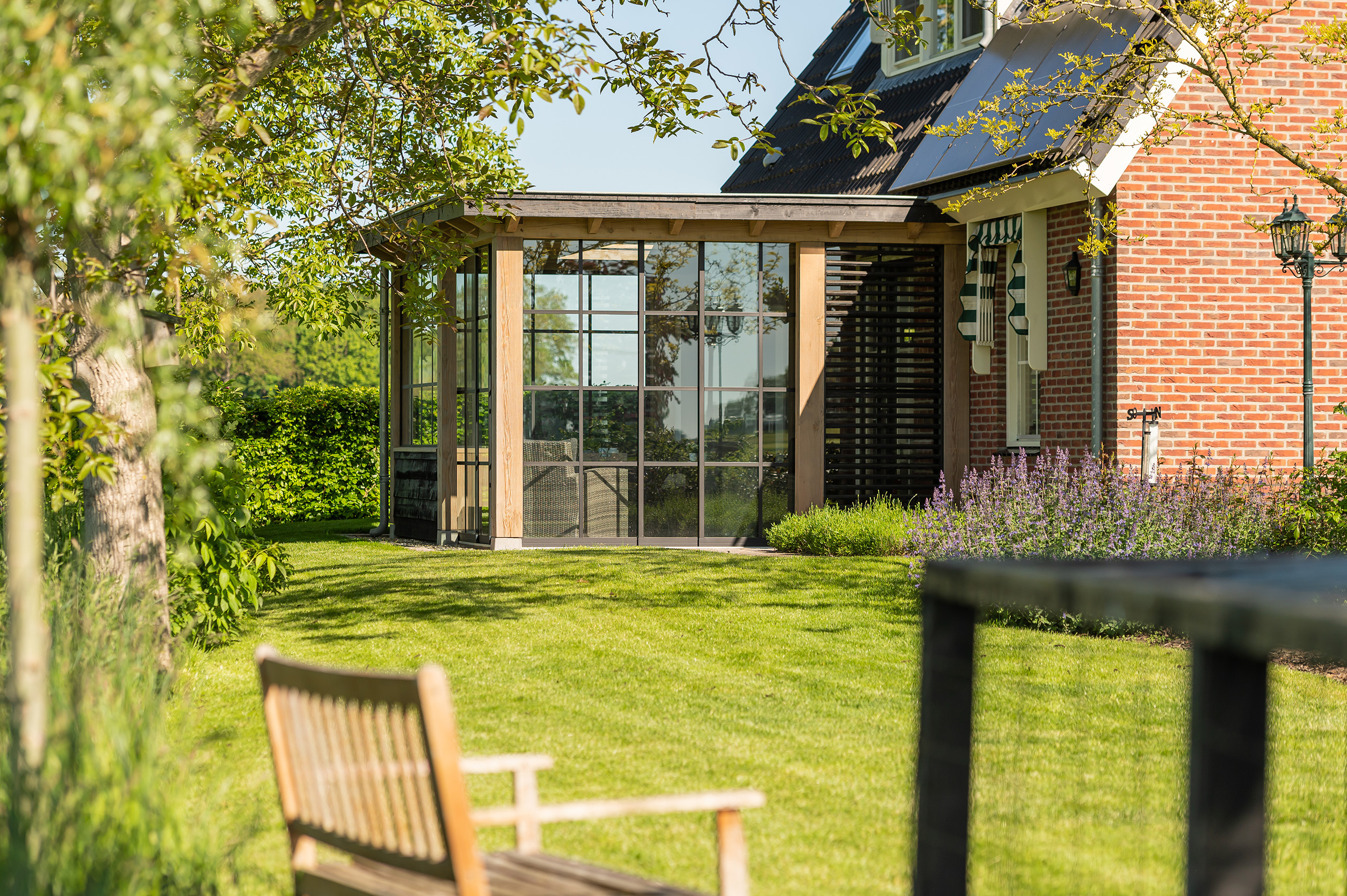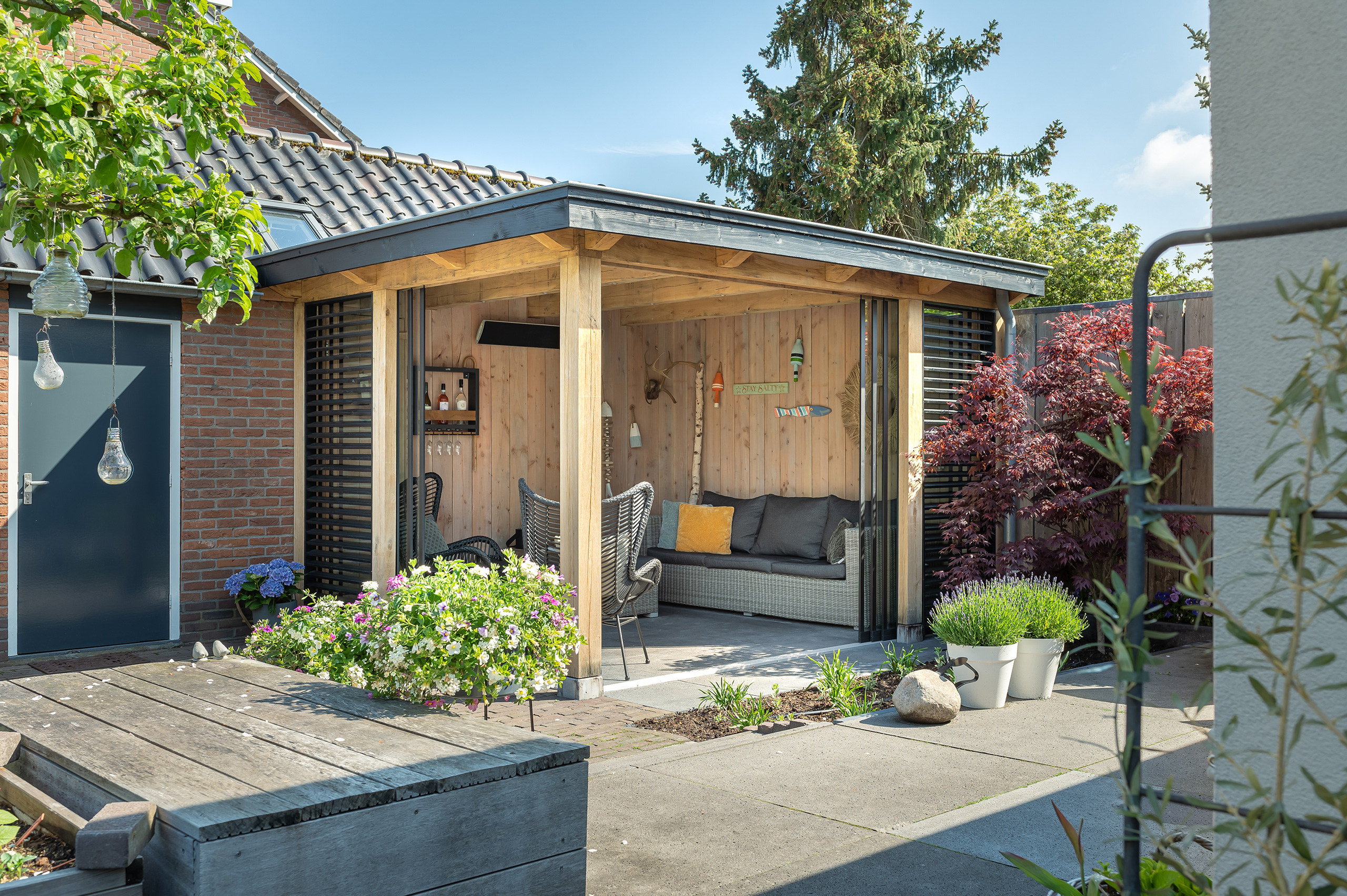 Met een goed gevuld dienblad loopt u door uw tuin naar uw tuinkamer. Daar wacht een gezelschap op u om samen te genieten van een heerlijke borrel. Of misschien zat u al even en verheugde u zich op de heerlijke hapjes. Midden in de tuin geniet u samen van het mooie uitzicht op de prachtige natuur. In de koudere maanden kan u het er zo warm maken als u wilt. Houd de deuren dicht en zet de kachel aan. Op warmere dagen is het een kleine moeite om de glazen schuifdeur even open te zetten. Maak de ruimte op temperatuur en haal de buitenlucht naar binnen. Klinkt dit als muziek in de oren?