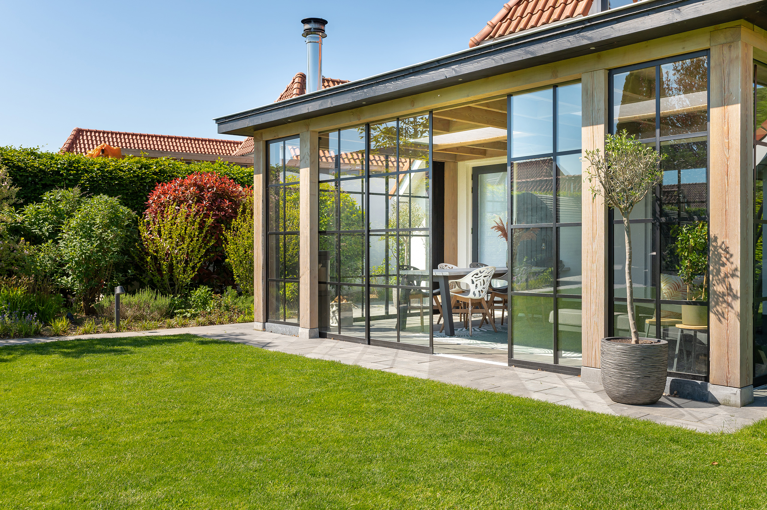 Stel, u geniet van het buitenleven, wilt deze graag naar binnen halen én u wilt dat ene regenbuitje vermijden. Ooit gedacht aan een buitenkamer? Deze staat tegen uw woning aan. Met andere woorden: u hoeft niet eerst naar buiten om bij het verblijf te komen. Vanuit de woonkamer stapt u zo de buitenkamer in. Op deze manier kan u door weer en wind een gemakkelijk zit nemen met zicht op de tuin. Richt de kamer in naar de stijl van uw woonkamer: dé sfeerbeleving! Haal binnen naar buiten!